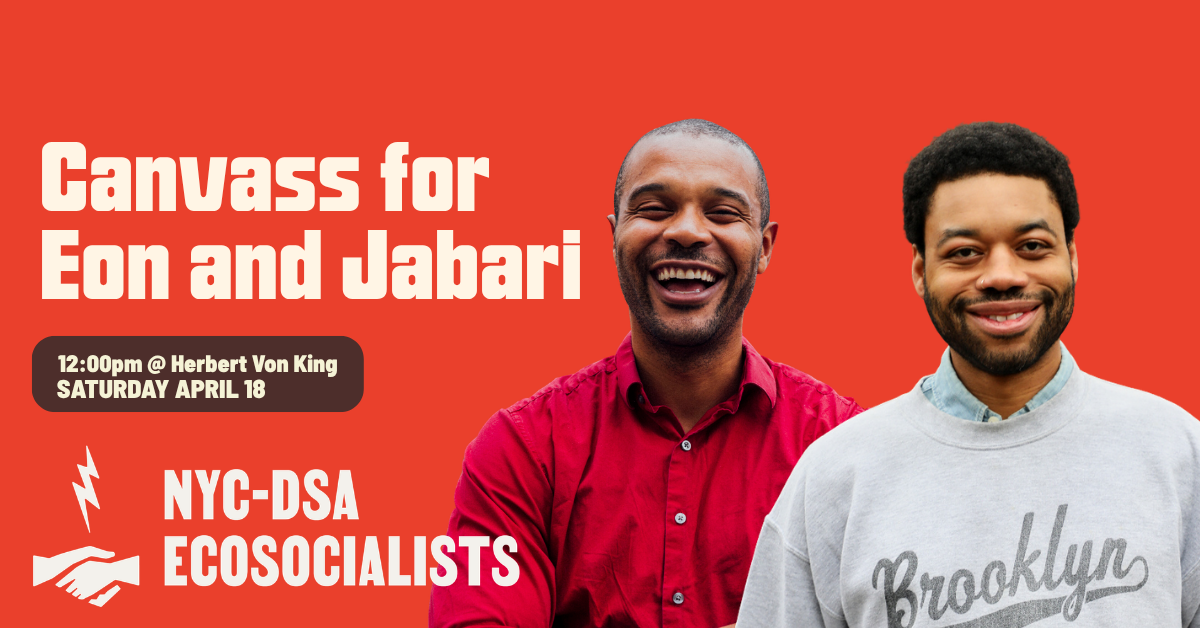 Join us for a joint canvass in Bed-Stuy with NYC-DSA's Ecosocialist Working Group! We'll be taking to voters about Eon's fight to make green investments in our public schools, freeze electricity rates for tenants and homeowners, and build out capacity for 100% renewable public power to fight the climate crisis and bring about true energy affordability!